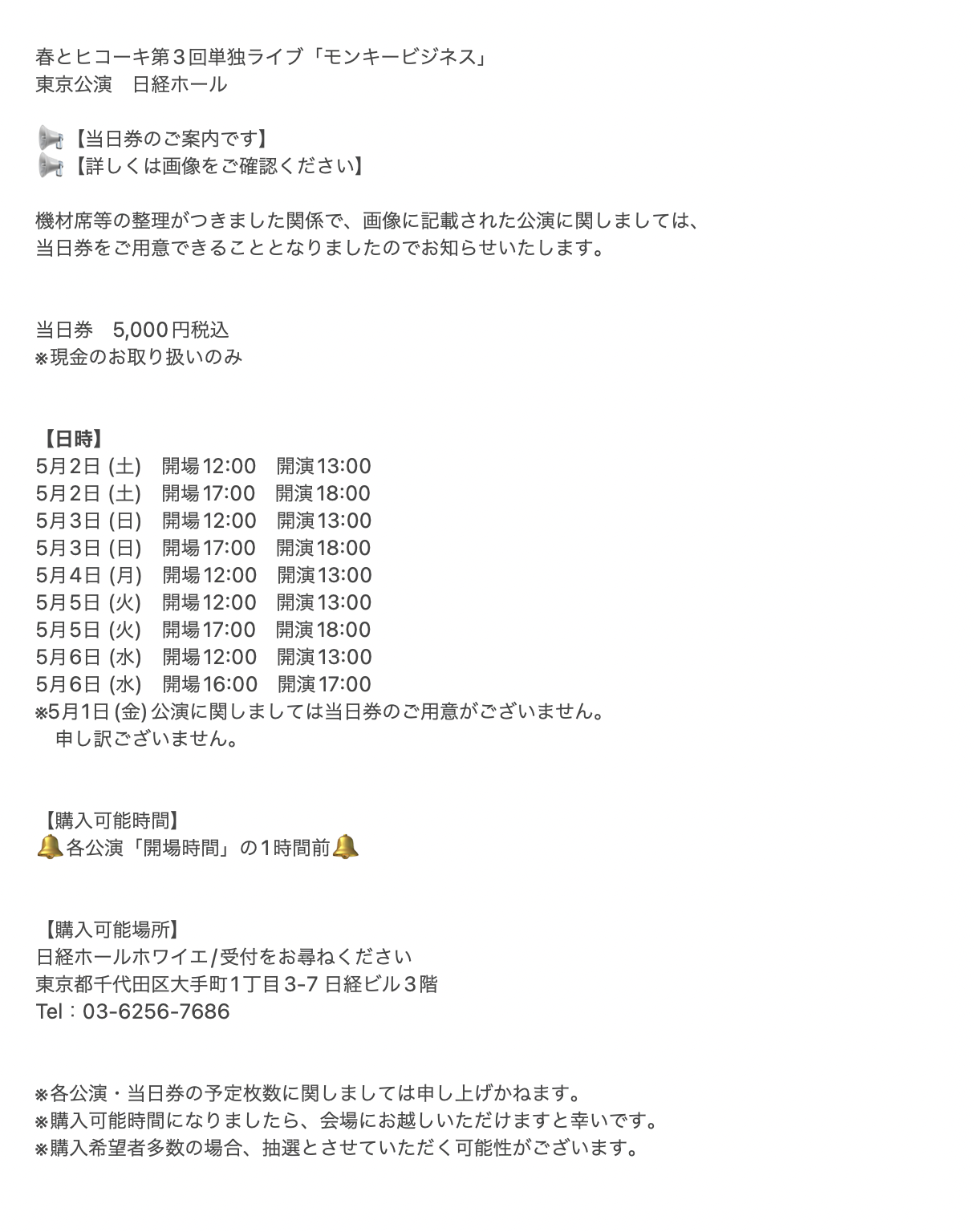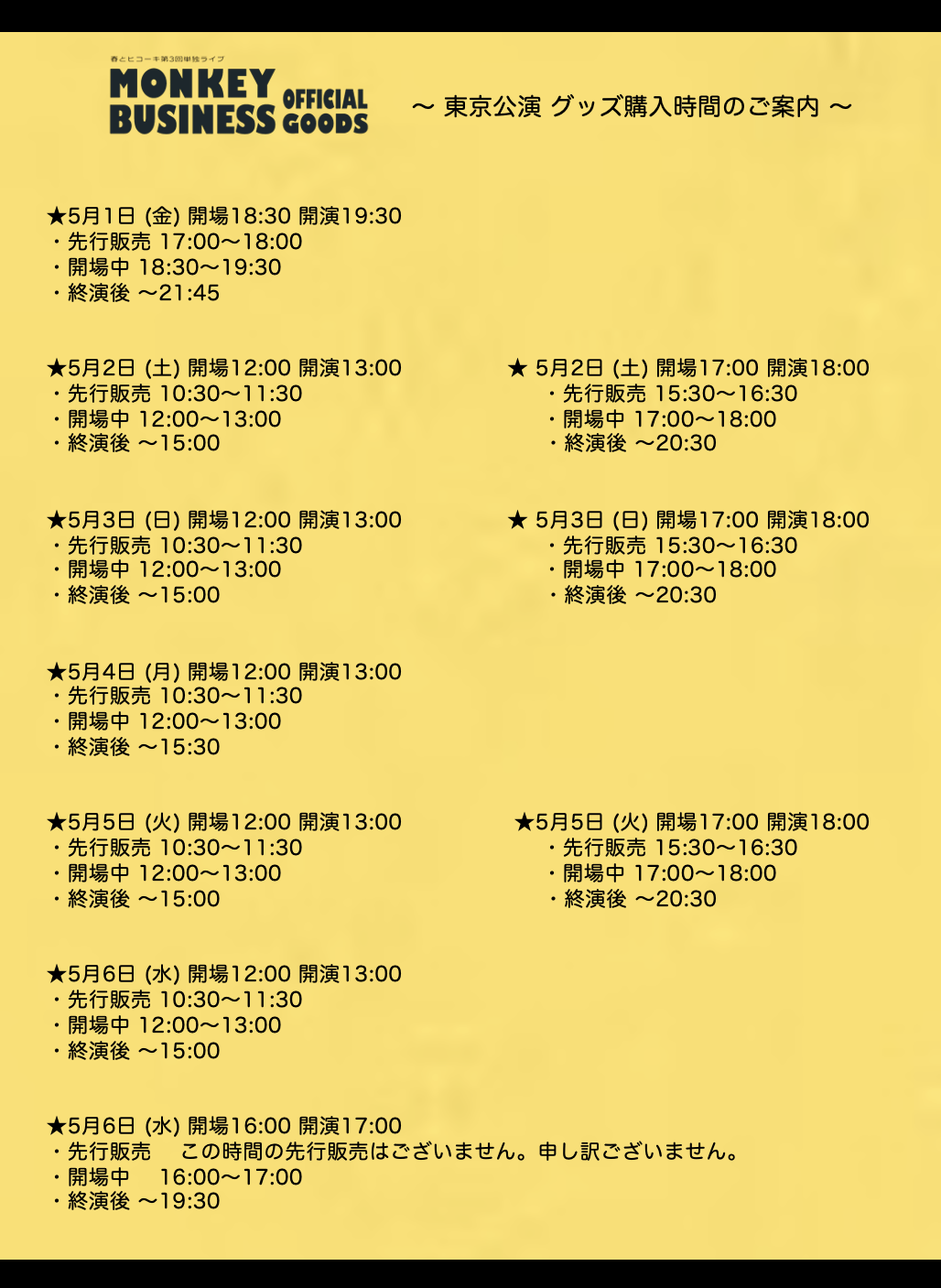 春とヒコーキ単独ライブ「モンキービジネス」 東京公演 当日券・グッズ購入時間のご案内